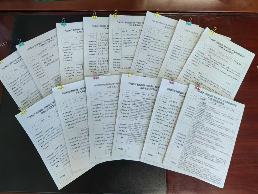 廣大職工積極響應(yīng)、踴躍參與,中層以上干部帶頭提交建議,充分發(fā)揮示范引領(lǐng)作用。本次活動共征集建議410條,經(jīng)過評審組兩輪篩選,最終評選出具有較高參考價值的有效建議30條,內(nèi)容主要涵蓋降本增效、信息化建設(shè)、轉(zhuǎn)型創(chuàng)新、安全管理、高質(zhì)量發(fā)展等多個方面,不僅增強了廣大干部職工的企業(yè)歸屬感和認同感,同時也充分體現(xiàn)了職工的主人翁意識和集體智慧,為汽運集團突破現(xiàn)階段發(fā)展瓶頸、加速轉(zhuǎn)型步伐提供了可借鑒、可落地的創(chuàng)新思路和解決方案。