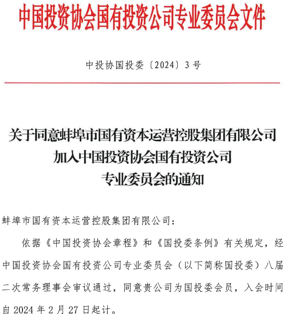 熱烈祝賀蚌埠國控集團加入中國投資協(xié)會國有投資公司專業(yè)委員會